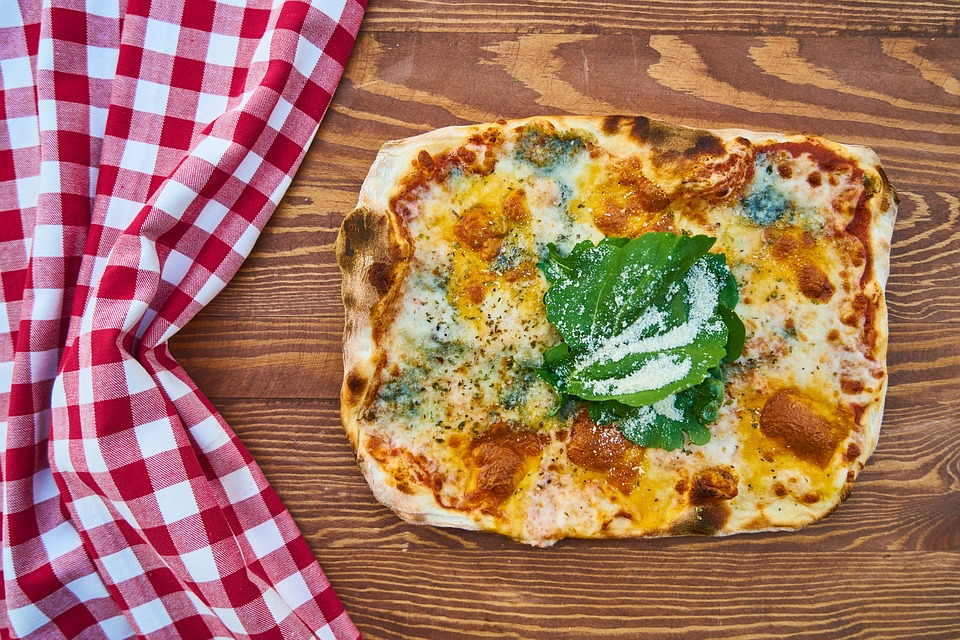 Cubrimos la base con la salsa de tomate que hemos preparado, repartimos el queso. Añadimos los aros de cebolla. Decoramos con las hojas de albahaca.